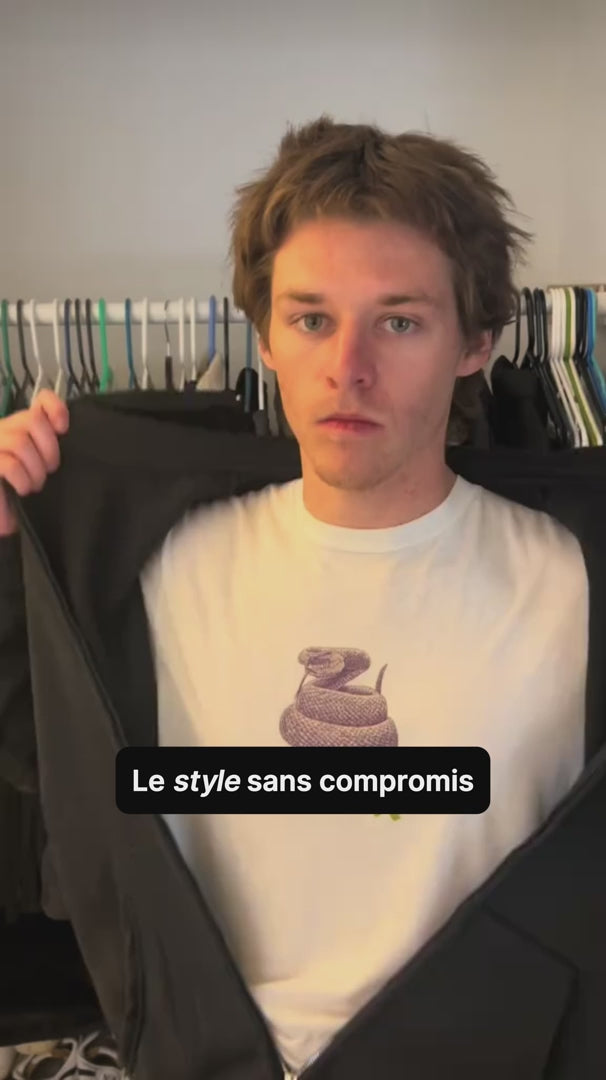 Minimaliste et un peu oversize, inspiré du streetwear. S’accorde aussi bien avec un jean qu’avec une veste technique. Un essentiel qui attire les regards.